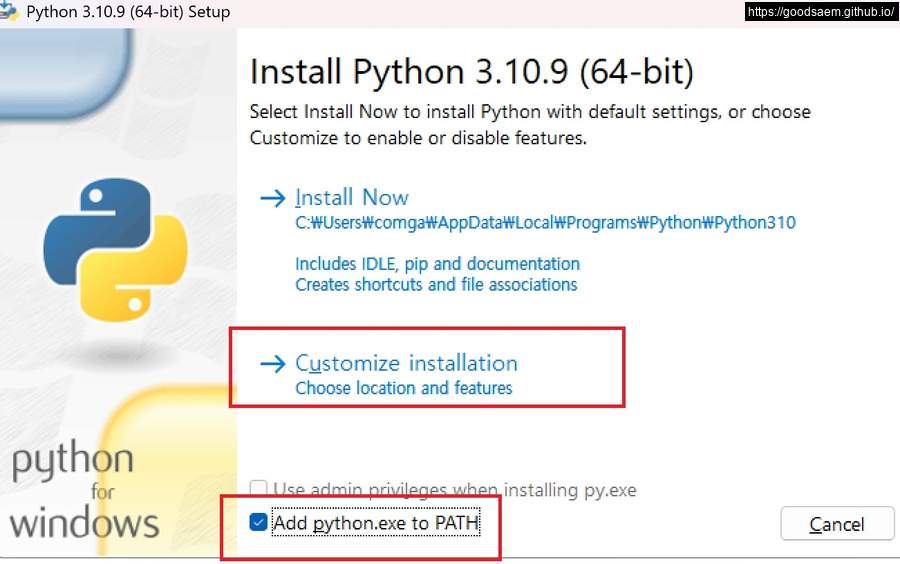 - Add python.exe PATH 체크하고 Customize installation 클릭